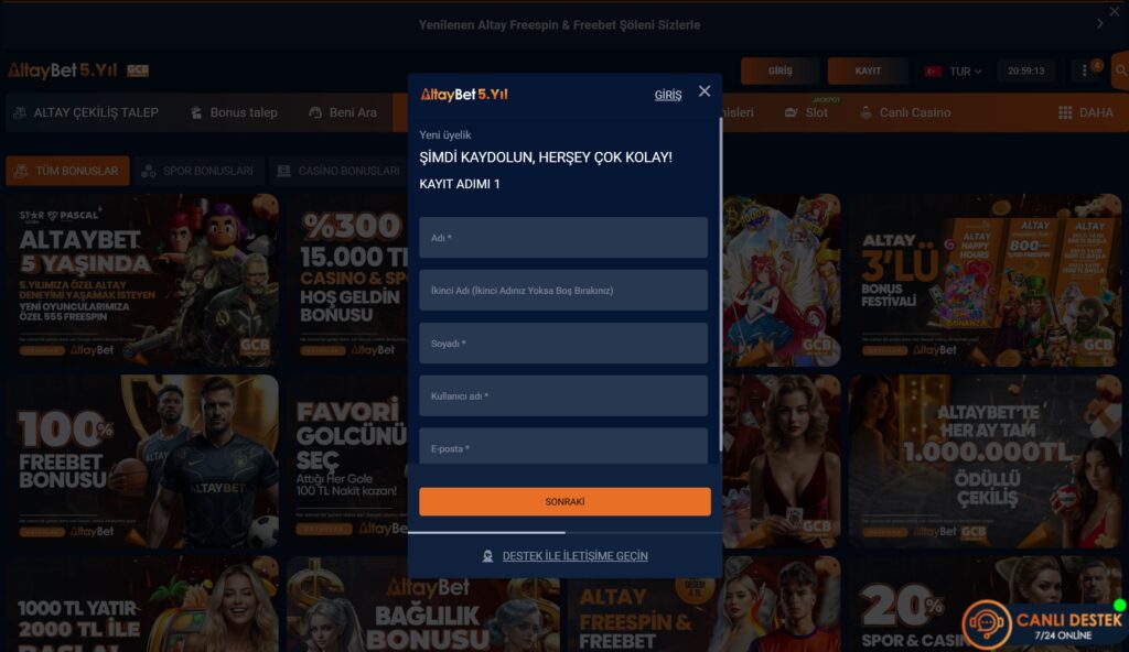 Altaybet hesap açma rehberimiz adım adım sizlere yardım sağlayacaktır, ancak sitenin canlı desteği de bu konuda yardım eder. Teknik bir problemle karşılaşırsanız hemen uzman temsilcilerden destek talebinde bulunun. Sitede bulunan kayıt ekranı birinci adımı;